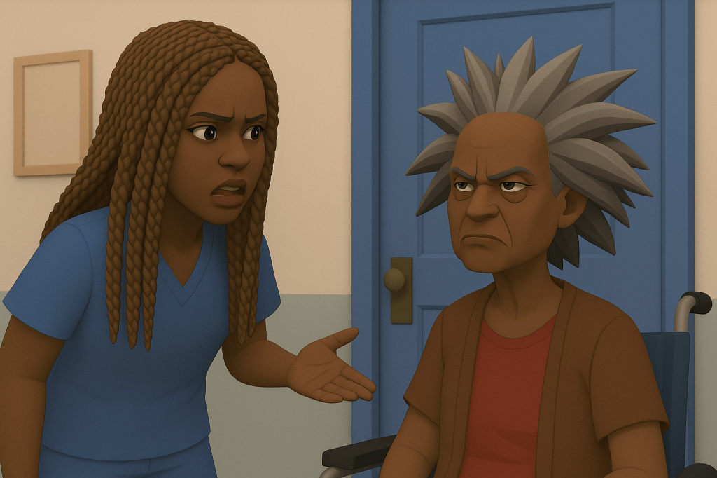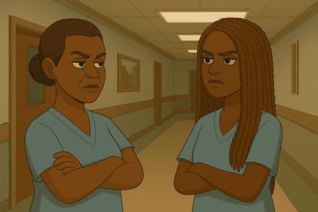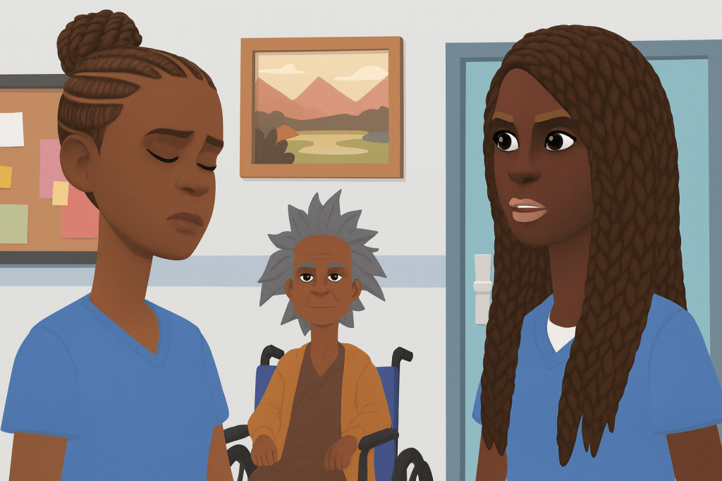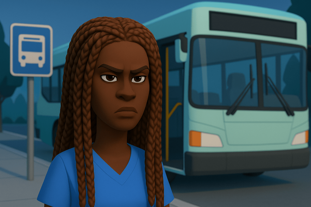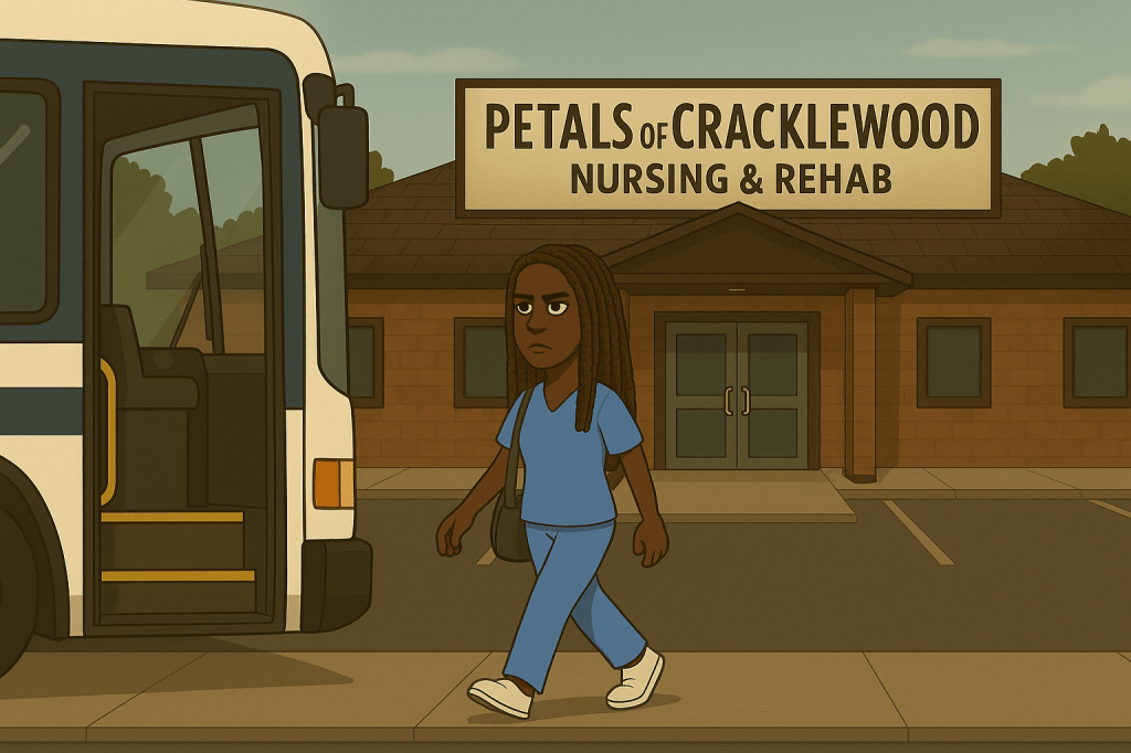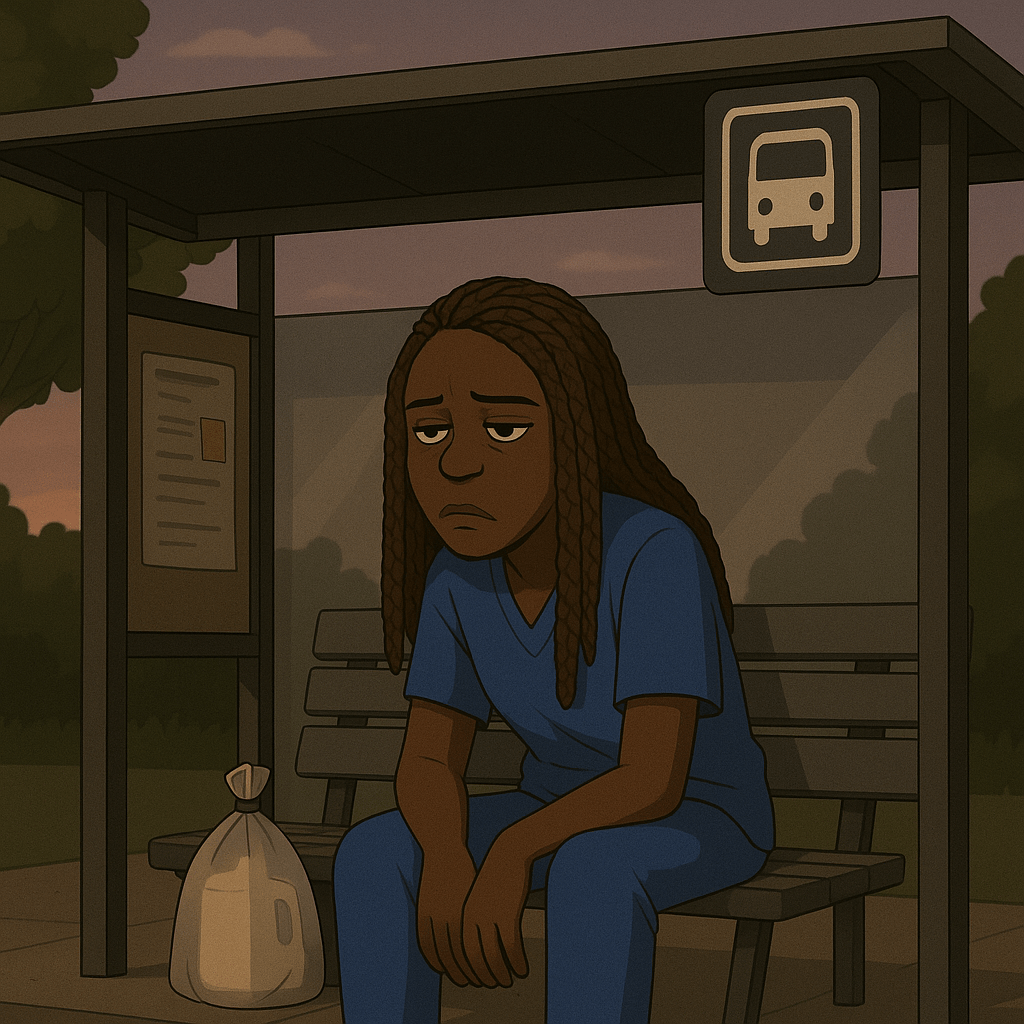 I threw on my navy scrubs — the ones that make me look like a big-ass blueberry — and ran to catch the 6:15 bus.
