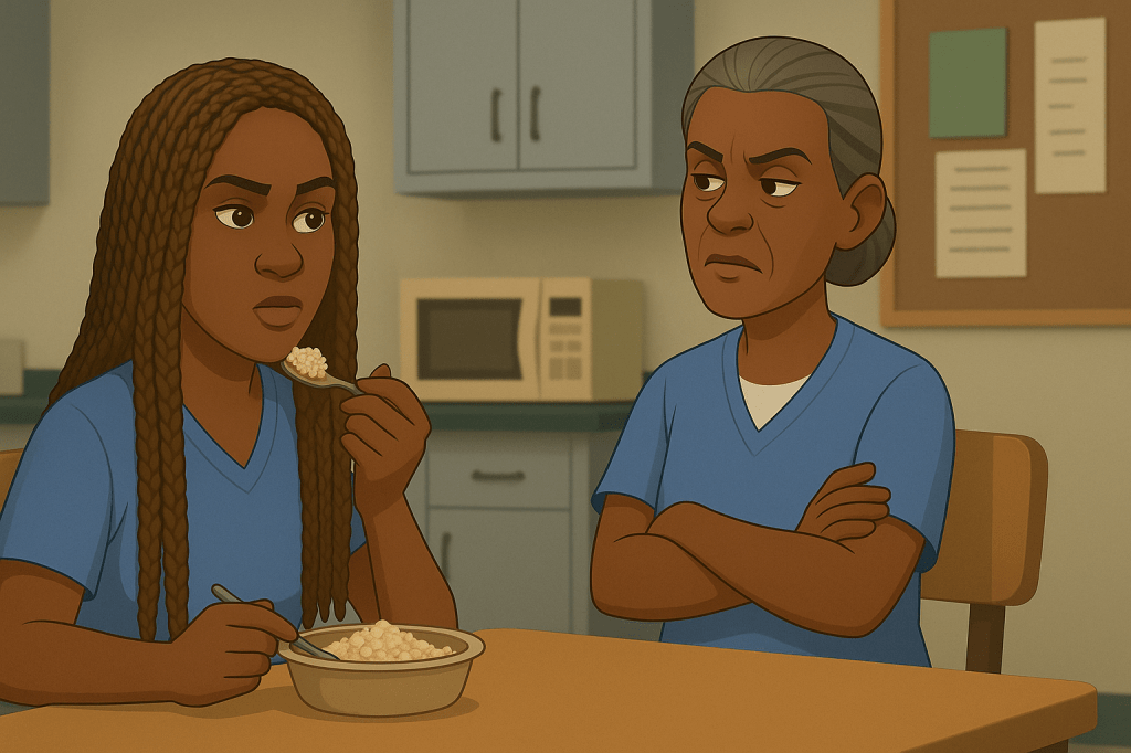 Then Miss Rose walked in watching me eat like I stole HER food.