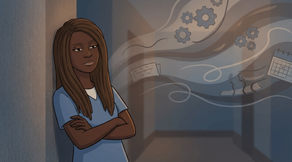Miss Rose already sitting at the desk with her clipboard, not doing shit.